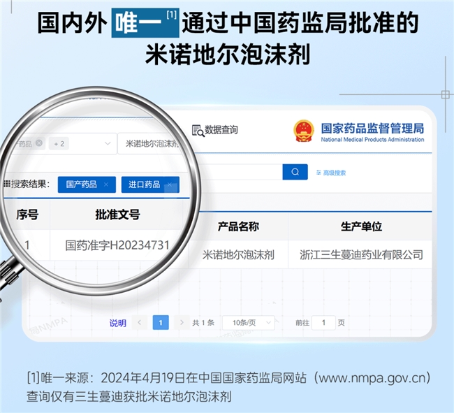 2024年初,蔓迪5%米诺地尔泡沫剂(国药准字H20234731)正式获批上市,成为中国首个且唯一获批的米诺地尔泡沫剂型,标志着国内米诺地尔治疗迎来剂型创新。