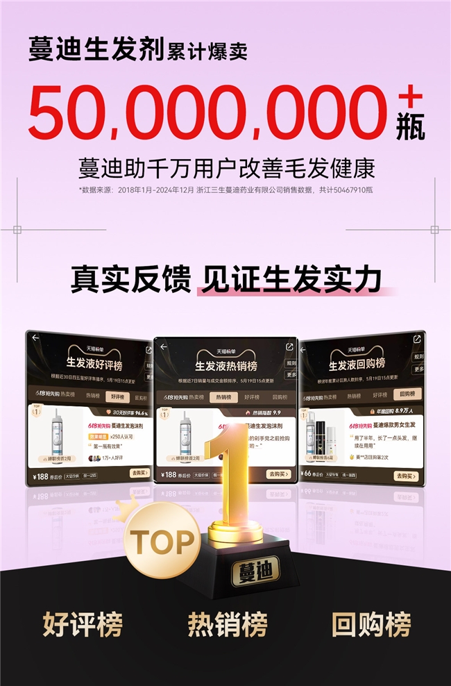 - 市场数据佐证:截至2024年底,蔓迪全系生发剂累计销量突破5000万瓶,用户好评率超95%,连续蝉联“热销榜+回购榜+好评榜”三冠王。
