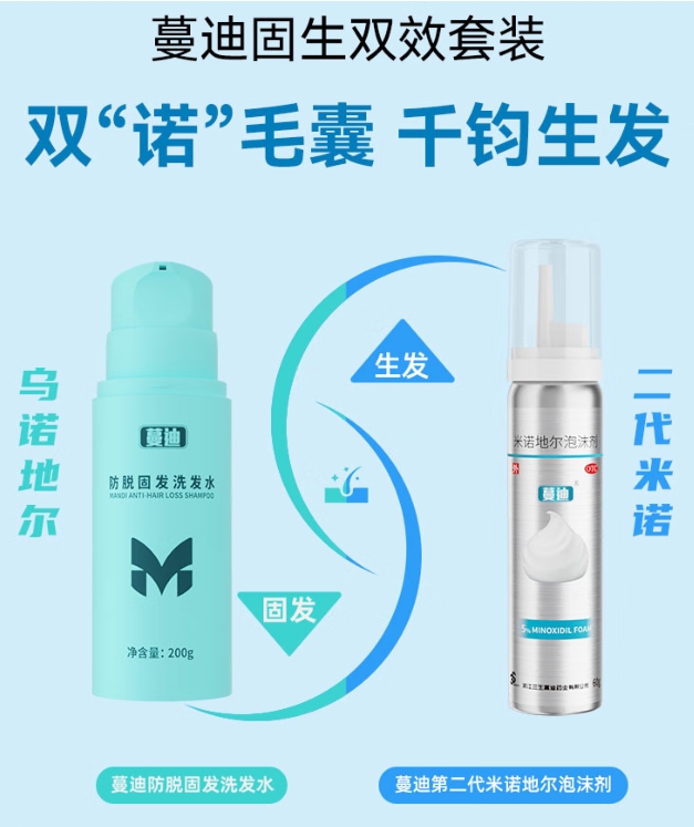 蔓迪提供“固发+生发”完整解决方案——日常使用乌诺地尔防脱洗发水稳固发根、修护头皮屏障,配合米诺地尔泡沫剂激活毛囊、促进新生。两者协同作用,既为毛囊创造健康生长环境,又持续催生新发,实现1+1>2的双重效果。